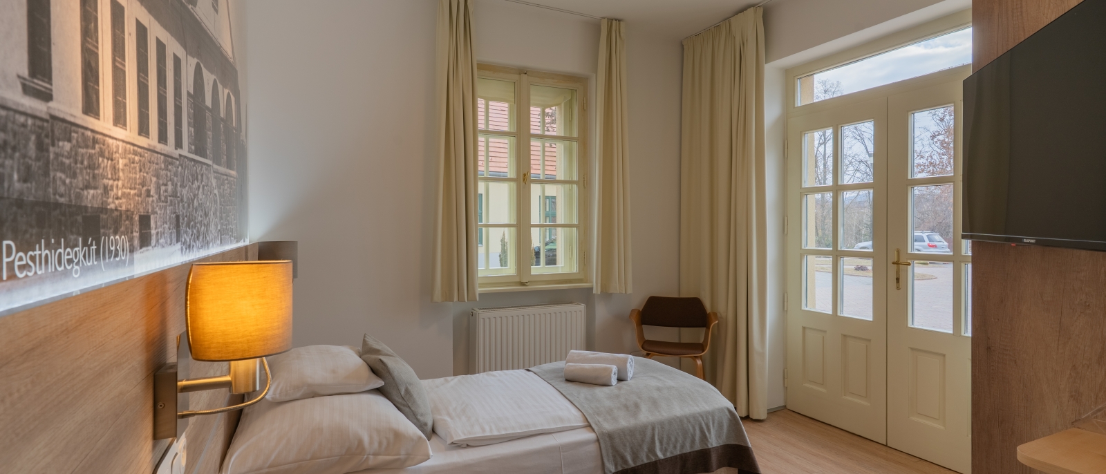Egyágyas szoba akadálymentes fürdőszobával, mely a parkolóból is közvetlenül is megközelíthető. Stílusos, egyszemélyes szoba, amely egyszerre kényelmes és praktikus. Letisztult, küszöbmentes kialakítása nemcsak a mozgáskorlátozott vendégek számára ideális, hanem mindazoknak, akik egy csendes, kényelmes egyágyas szobát keresnek.
