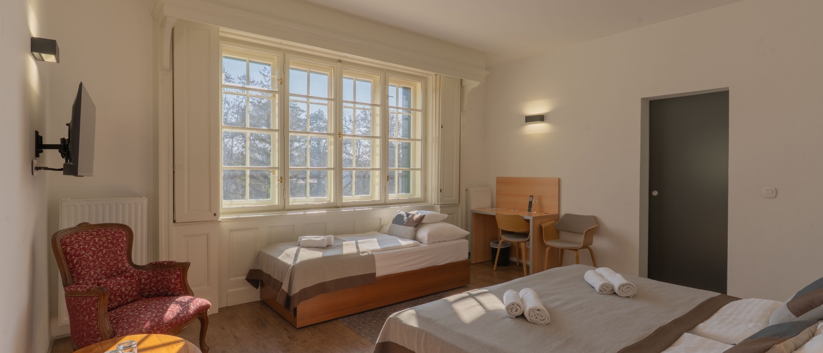 Háromágyas szoba 1 db dupla ággyal plusz 1 db különálló ággyal, zuhanyozós fürdőszobával