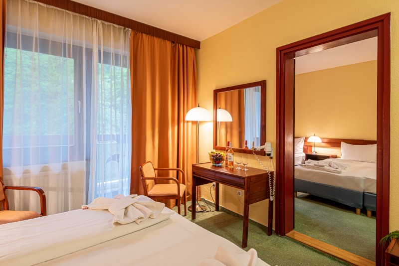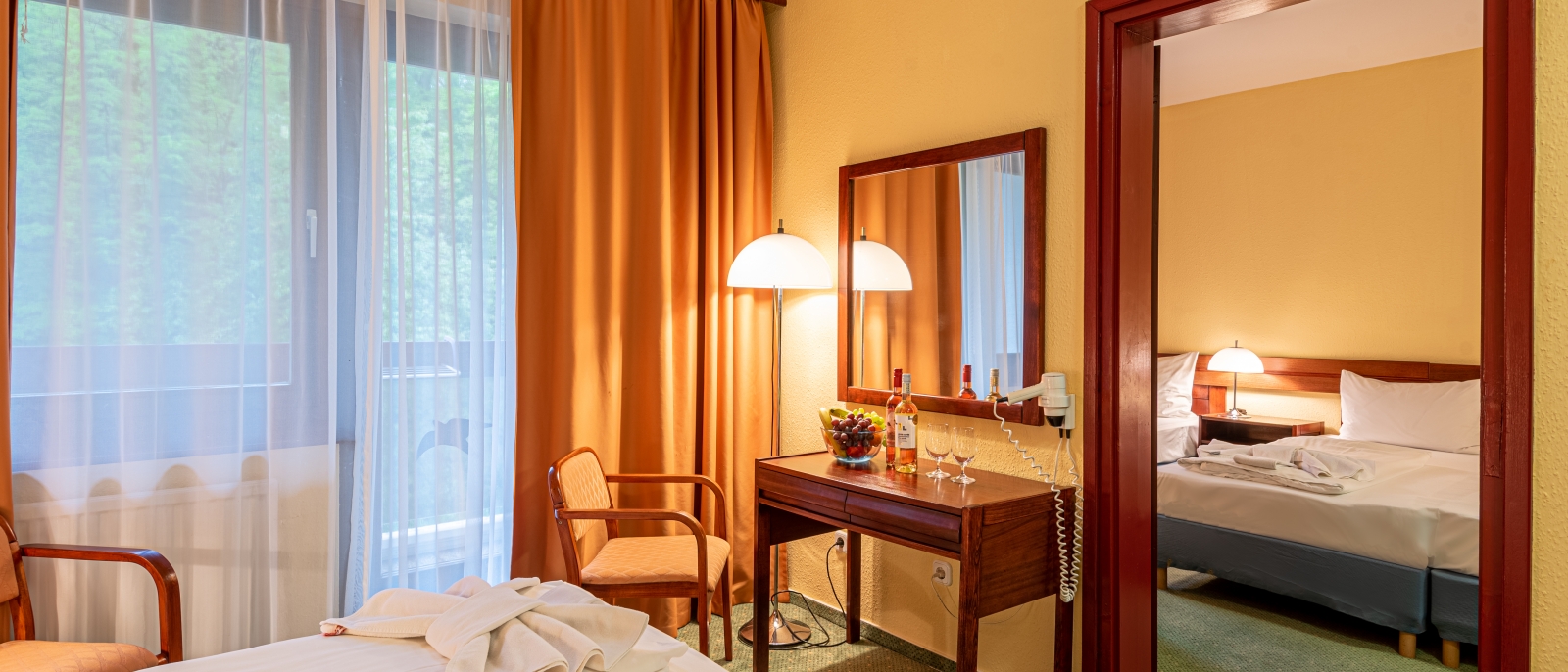 Az igazi felhőtlen családi, baráti kikapcsolódáshoz válasszák szállodánk legtágasabb, legkényelmesebb szobáit, melyek 2 x 20 m2 nagyságúak. Összenyitható szobáink erkélyesek, valamint két fürdőkádas fürdőszobával felszereltek.