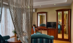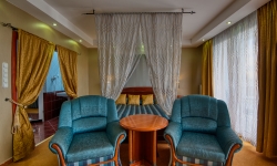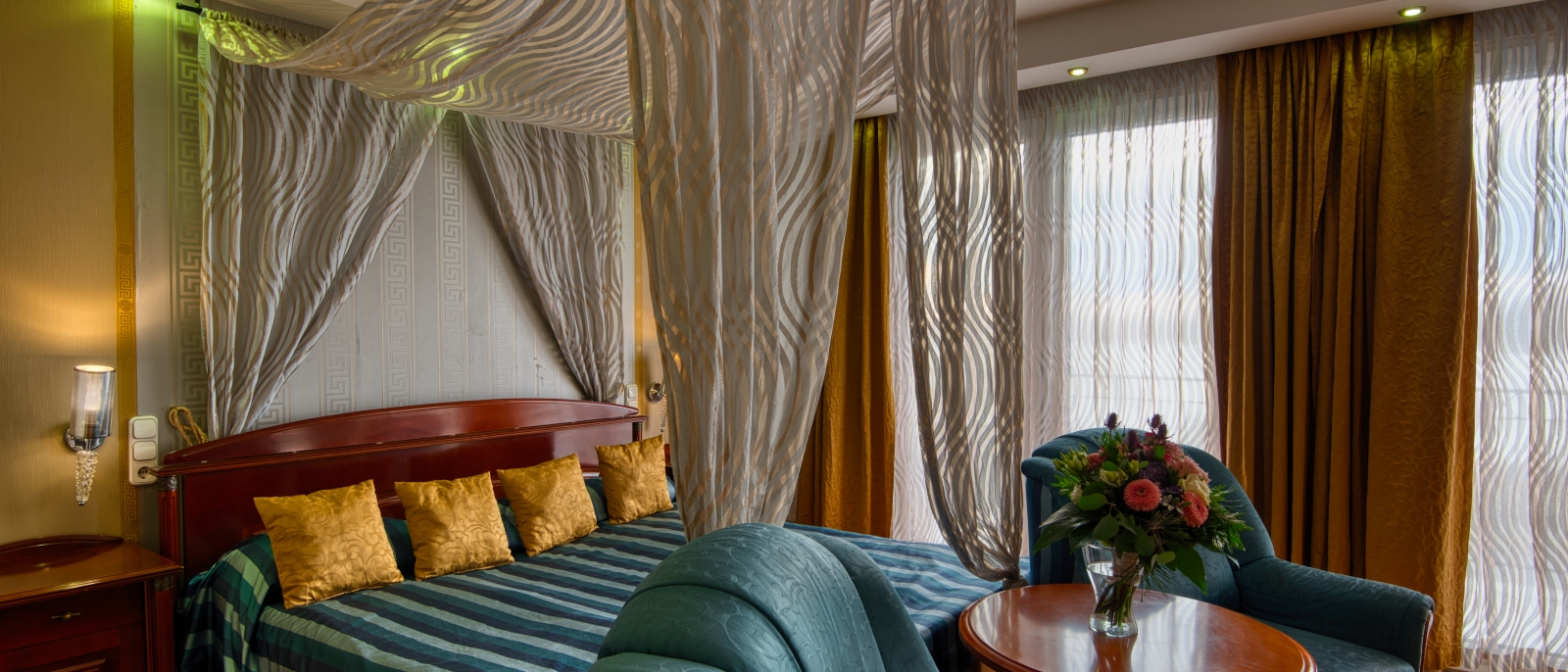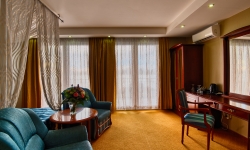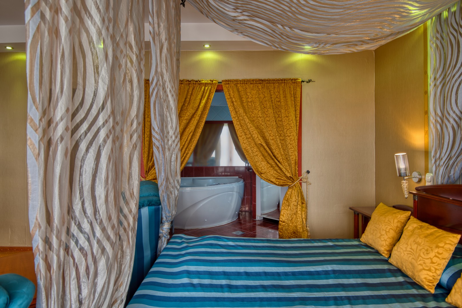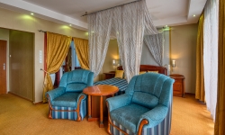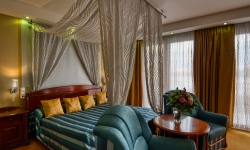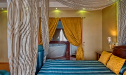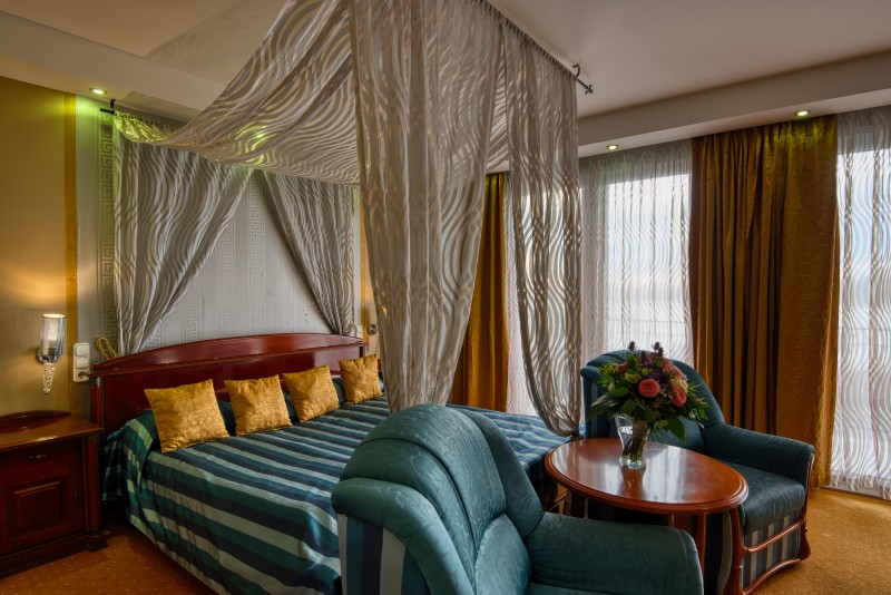 A hatalmas kényelmes baldachinos franciaágy, (Billerbeck matraccal), padlószőnyeg és fantasztikus panoráma mellett, lakosztályunk különlegessége a hálószobával egybe nyitott fürdőszoba, s az ott található pezsgőfürdő teszi még feledhetetlenebbé az itt eltöltött időt.